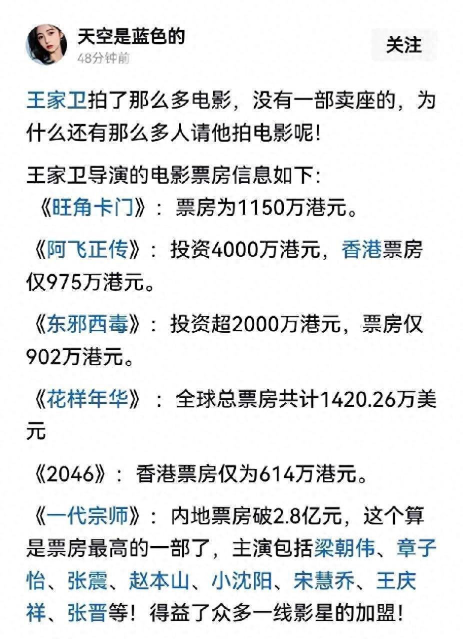 王家卫的电影票房一直不算高,他最卖座的作品《一代宗师》也只收获2.8亿票房,这个数字放在当下,甚至比不上很多小成本网络电影,但奇怪的是,观众和影评人依然将王家卫视为大师,这种市场反响与业内评价的反差值得思考。
